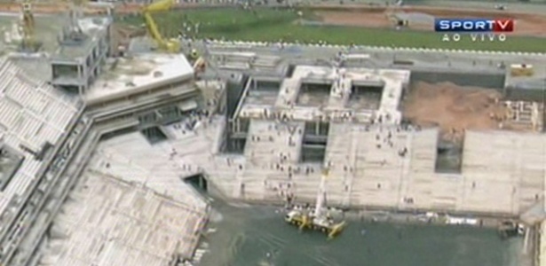 Neste domingo, os trabalhos estão parados e o Itaquerão não contava com operários. Apesar disso, era perigoso transitar pelo canteiro de obras. Guindastes, tratores, fossos sem proteção e pedaços de concreto e ferro aparente estão por toda a parte.