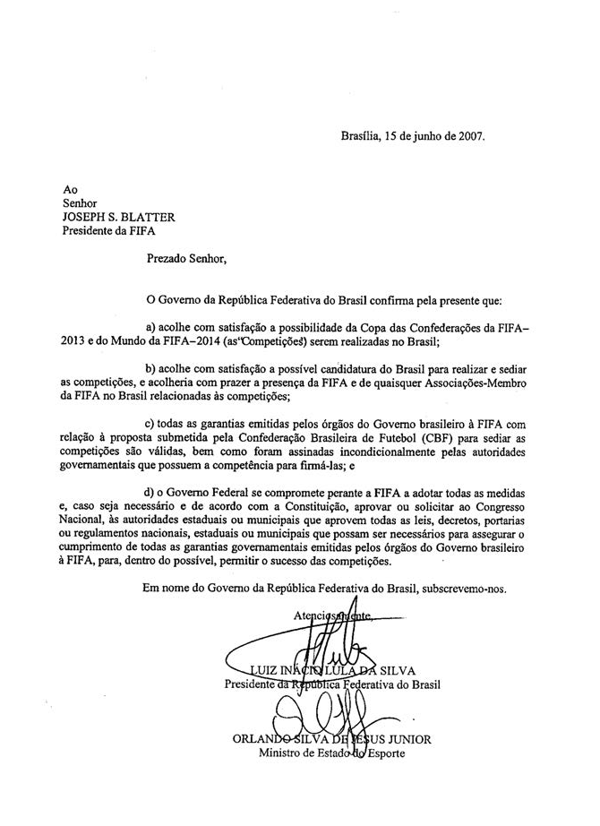 “Caso o Comitê Organizador Local estabelecido pela Confederação Brasileira de Futebol (CBF) seja selecionado pela FIFA para receber e organizar a Copa das Confederações FIFA 2013 e a Copa do Mundo FIFA 2014 (as “Competições”), nós por meio deste representamos e garantimos à FIFA e asseguramos que as seguintes medidas serão implementadas e operativas, de acordo com a legislação especial específica se necessário, pelo menos doze (12) meses antes do início da Copa das Confederações FIFA 2013″.