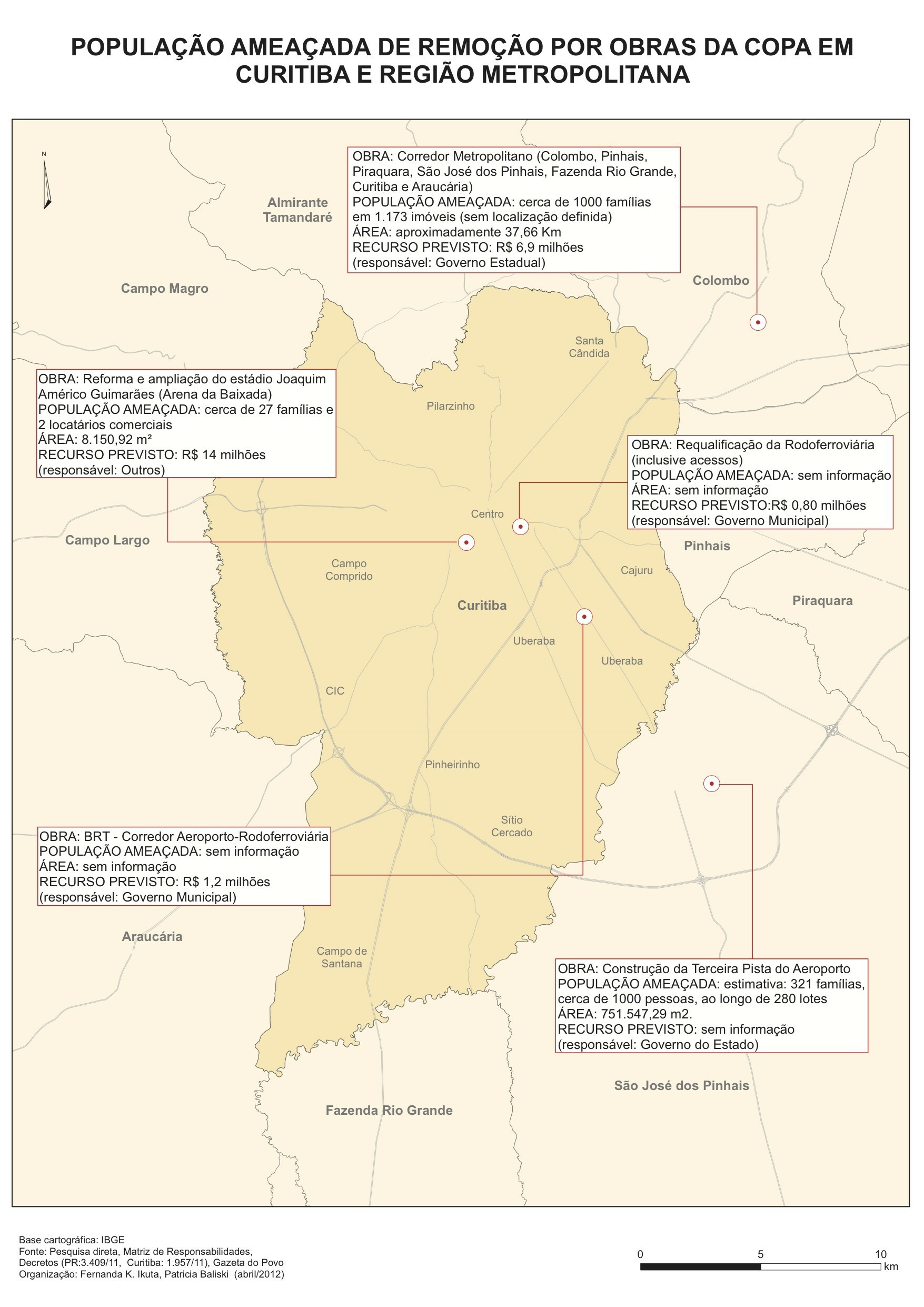 Cerca de 2.000 a 2.500 famílias, em sua maioria de baixa renda, estão ameaçadas de remoção pela Copa em Curitiba e sua região metropolitana, como é possível verificar no mapa da população ameaçada de remoção (no final da matéria), só a obra de requalificação de vias do Corredor Metropolitano poderá remover ao menos 1000 famílias.